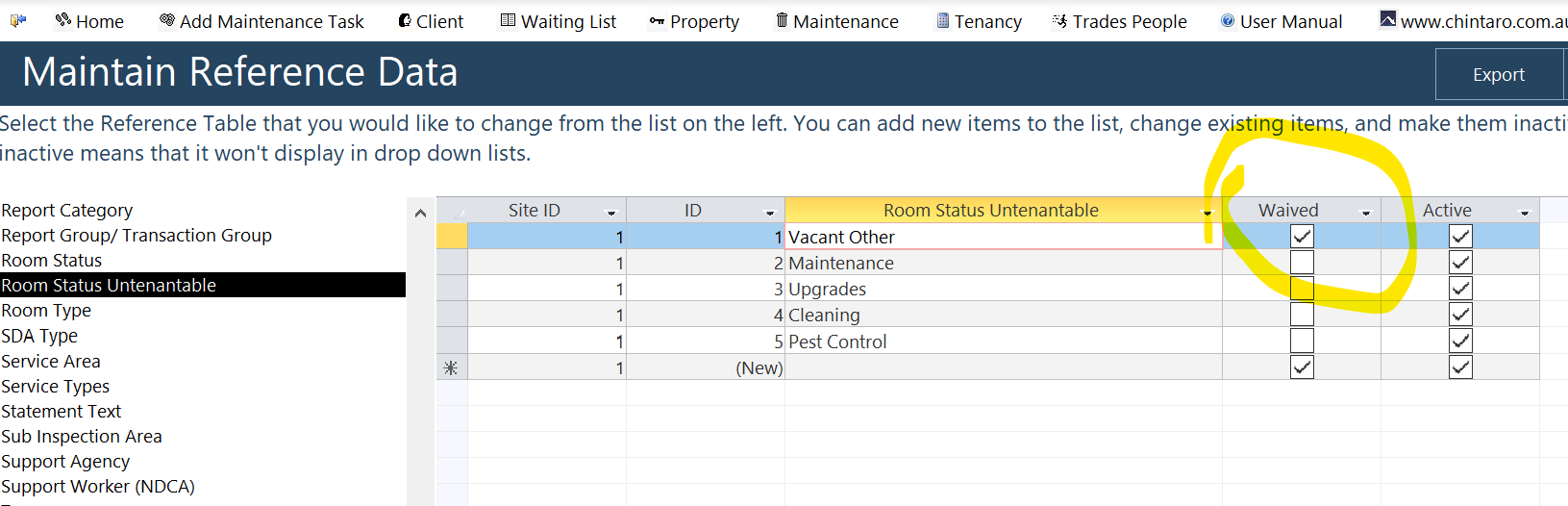 If you have properties that are Vacant Waived, or Vacant Other, you will need to indicate which Vacant Untenantable reasons will fall under this category. From the Reference Tables, click Room Status Untenantable and select which of the options you have are considered 'Waived':