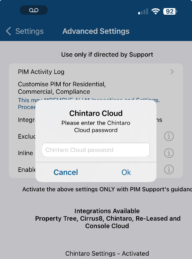 7. Tap 'Advanced> Advanced, Integrations and About'> scroll down to Chintaro Settings> Tap the toggle to Enable Chintaro: