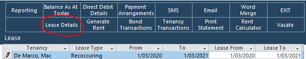 From the Home Screen, click Tenancies, then Manage Tenancies and search for the Tenant with the lease details you want to add. Double click their row to open their Tenancy Screen.