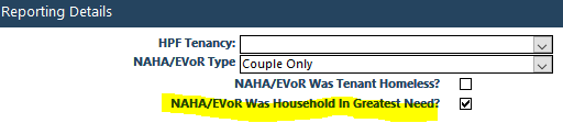 | k.) At allocation, was the household in the greatest need? | Yes - Tenancy Screen > Reporting function. For every Tenancy, the 'NAHA/EVoR Was Household In Greatest Need' will default to ticked. Untick if this was not the case. | ||