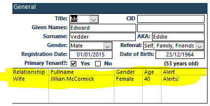 | b.) Is this the principal Tenant? | Yes - Client screen. Select either Primary Tenant = Yes or No for each Client. If Primary Tenant = Yes, other household members appear in the household box below: If Primary Tenant = No, Primary Tenant's details appear on Client's screen: | ||