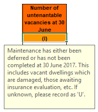 | l.) Number of untenantable vacancies at 30 June | N/A | No - Property screen. The formula for these cells is calculated from each Room's Status = Total Vacant Untenantable Units. This is a subset of the total number calculated in Column i. |