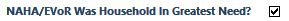 | GreatestNeed | Was the household in the Greatest Need? | Yes - Tenancy Screen > Reporting Tab. NOTE: This field will default to ticked as it is assumed the household was in the greatest need of housing when allocated. | |