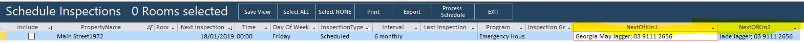 - Schedule Inspections - 2 columns added for Next of Kin: Enhancement for Disability Service Providers to be able to contact the Client's Next of Kin 1 and 2 (name and phone for each):