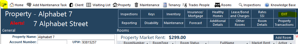 To return to the Manage Healthy Homes screen, select the Exit button at the top of the Property screen or the 'Exit this screen' Arrow at the top left of the screen