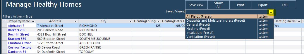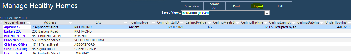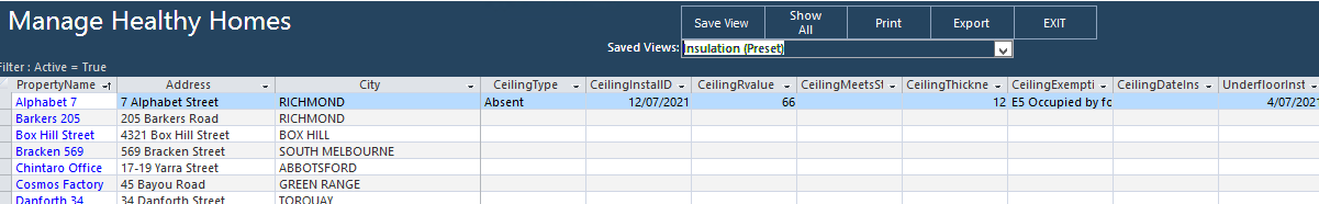 Each saved view displays the fields related to that aspect of the Healthy Homes data eg Insulation